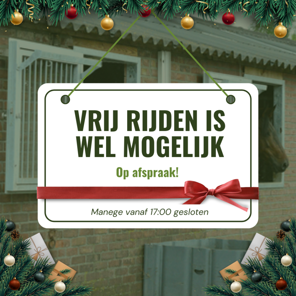 Elke zondag is er de mogelijkheid om ‘vrij’ te rijden. De manege is dan geopend van 10.00 tot 16.00 uur.